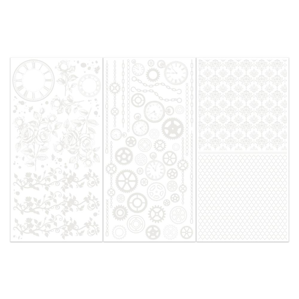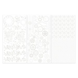 The Irresistable Times set from Joanne Bain includes vines, cogs (gears), and various textures. These rub-ons are typically used in scrapbooking, card making, and other paper crafts to add intricate details and a vintage or steampunk aesthetic.