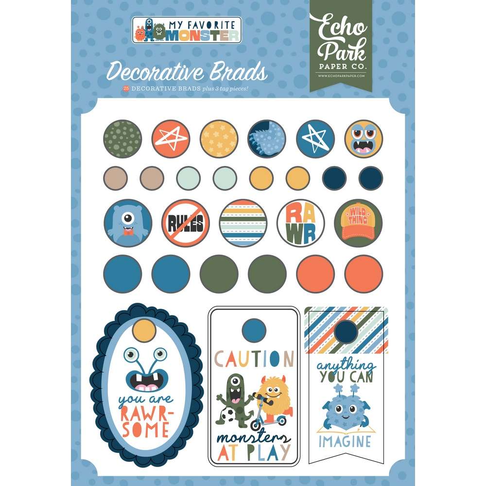 Our adhesive brads include a selection of metal and enamel brads with chipboard elements featuring designs from the collection.