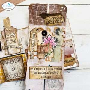 This set allows you to create an interactive folding pocket with a closure, and includes tags and decorative elements. The perfect place to store your tags and ephemera.