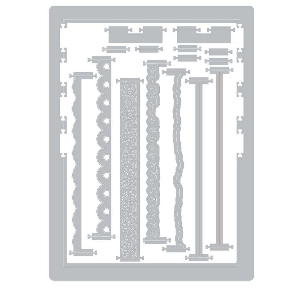 The set includes interchangeable edge designs like scalloped, ripped, and lace, allowing you to mix and match elements that snap in and out of your die for complete personalization.