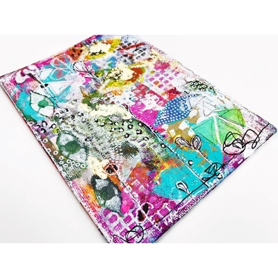 The Paint Splatters stencil by Rae Missigman mixes splashes of color with mark-making circles, dashes, and hearts – it’s the ultimate in versatility! Use part or all of the design for fabulous textures and layers in your mixed media artwork, monoprinting, art journaling, and more!