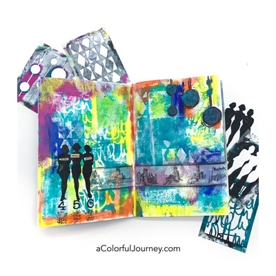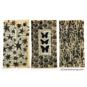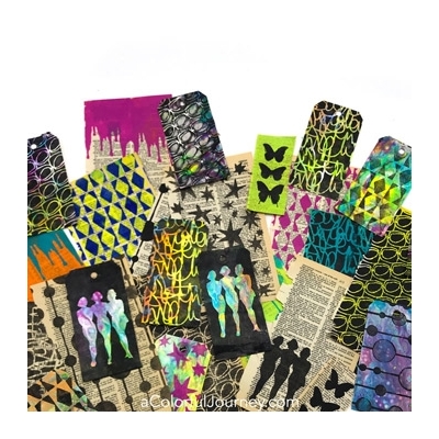 These 9 ATC-sized images play well in the foreground or background, making this a fabulous stencil for creating artist trading cards, art journal pages, greeting cards, and more! Don’t forget to snip out the 3 friends so you also have a mask to use.