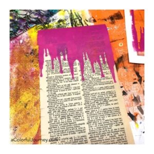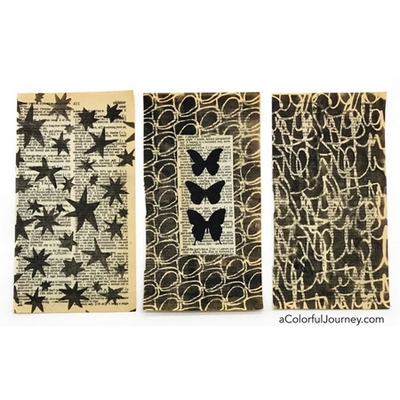 Carolyn Dube’s ATC Mixup stencil is filled with her faves: wonky eyes and butterflies, your tribe, planets aligned, stars and diamonds, paint drips, scribble writing, and archaeological blueprints.